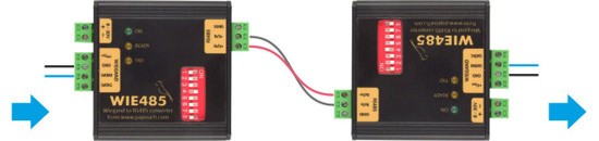 Sada dvou modulů WIE485 je dodána a přednastavena tak, že stačí jen zapojit Wiegand, napájení a kroucenou dvoulinku podle obrázku a systém je připraven k činnosti. Podrobné technické parametry použitých modulů WIE485 jsou k dispozici v technické dokumentaci, která je ke stažení níže.